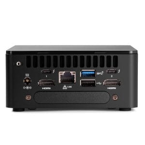 Een Micro-PC als geen ander. Met zijn afmetingen van 11x11cm zijn er weinig toepassingen waar de NUC niet in past. De NUC’s zijn bekend om zijn afmetingen, maar niet alleen in groottes, ook in wat hij kan bieden voor zijn afmetingen. De Asus NUC12WSHi3 heeft een Intel Core i3-1220P 10-Core processor met een kloksnelheid van 1.1 – 4.4 GHz. De NUC heeft ook een Intel UHD Graphics grafische chip, die voldoende grafische kracht biedt om lichte games te spelen of om een 4K beeldscherm aan te sturen op 60Hz. De NUC heeft ruimte voor maximaal 64 GB DDR4, M.2 SSD (NVMe) en een 2,5 inch SSD/HDD. Naast de inbouwmogelijkheden heeft Intel er ook voor gezorgd dat het zeer compleet word geleverd. De NUC komt al met een Intel AX211 wifi module met Bluetooth 5.2. Ondanks zijn zeer kleine formaat biedt de NUC toch heel wat aansluitingen. De Asus NUC12WSHi3 heeft 2x HDMI 2.0b, 2.5Gb LAN, 2x USB 3.1 (gen1, type-A), 2x USB3.1 (gen2, type-C Thunderbolt 4), USB 2.0 en een hoofdtelefoon/microfoon aansluiting.