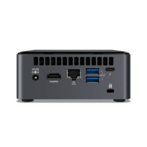Een Micro-PC als geen ander. Met zijn afmetingen van 11x11cm zijn er weinig toepassingen waar de NUC niet in past. De NUC’s zijn bekend om zijn afmetingen, maar niet alleen in groottes, ook in wat hij kan bieden voor zijn afmetingen. De NUC10I5FNH heeft een Intel Core i5-10210U Quad-Core processor met een kloksnelheid van 1.60 – 4.20 GHz. De NUC heeft ook een Intel UHD Graphics grafische chip, die voldoende grafische kracht biedt om lichte games te spelen of om een 4K beeldscherm aan te sturen op 60Hz. De NUC heeft ruimte voor maximaal 64 GB DDR4, een M.2 SSD en plek voor 1 2.5″ HDD/SSD. Naast de inbouwmogelijkheden heeft Intel er ook voor gezorgd dat het zeer compleet word geleverd. De NUC komt al met een Intel AX200 wifi module met Bluetooth 5.0 en vier microfoons aan de voorkant. Ondanks zijn zeer kleine formaat biedt de NUC toch heel wat aansluitingen. De NUC10I5FNH heeft een HDMI 2.0, Gigabit LAN, 3x USB 3.1 (gen1, type-A), 2x USB3.1 (gen2, type-C), een SD kaartlezer aansluiting. Als laatste is er ook nog een infrarood ontvanger aan de voorkant, wat het ook handig maakt voor gebruik als een Media PC. Let op, deze NUC heeft geen audio jack en microfoon aan de voorkant, de audio gaat via de HDMI of USB-C (Thunderbolt) poort.